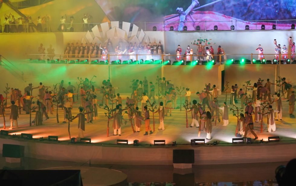La puesta reunió a 750 artistas en escena, entre bailarines, actores y músicos, con música 100 % en vivo y un importante despliegue visual. Entre los recursos escénicos se destacaron 600 metros cuadrados de cajas lumínicas, patrimonio escenográfico de la Vendimia, así como el regreso de los frisos iluminados en el frente del escenario. También volvieron elementos clásicos recordados por el público, como el tango en el agua, los pisos iluminados desde abajo, la cinta transportadora de botellas y el tradicional gaucho brindando.