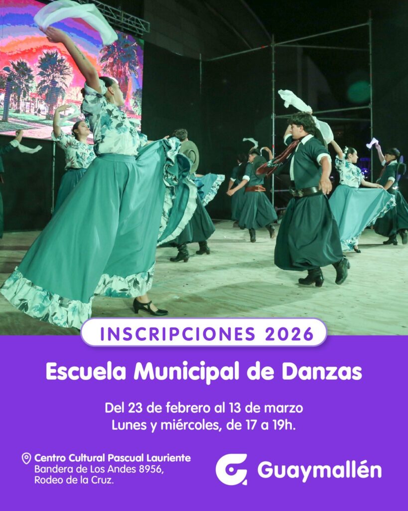 Desde el próximo lunes 23 de febrero hasta el 13 de marzo, niños, jóvenes y adultos que deseen formar parte de la Escuela Municipal de Danzas de Guaymallén, podrán anotarse en el Centro Cultural Pascual Lauriente, los días lunes y miércoles de 17 hs. a 19 hs.