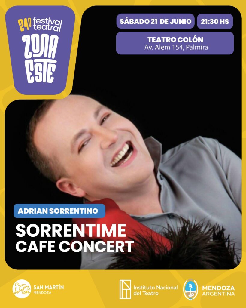 El talentoso y multifacético actor mendocino Adrián Sorrentino llega al departamento de San Martín para presentar su espectáculo “SorrenTime”, una propuesta encantadora que revive el espíritu del café concert con una fusión de arte y emoción. La cita será el sábado 21 de junio a las 21:30 horas en el Cine Teatro Colón de la ciudad de Palmira.