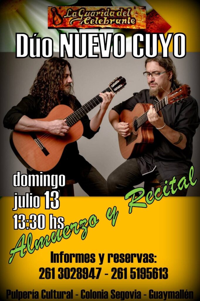 El domingo 13 de julio, desde las 13:30 hs., el tradicional espacio La Guarida del Celebrante, ubicado en Buenos Vecinos 7598, Colonia Segovia, Guaymallén, será escenario de un imperdible almuerzo recital con la presentación del reconocido Dúo Nuevo Cuyo, integrado por Guillermo y Gustavo Micieli.