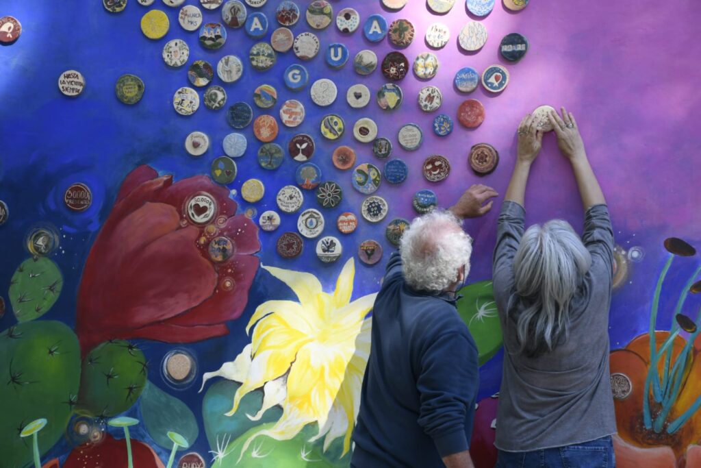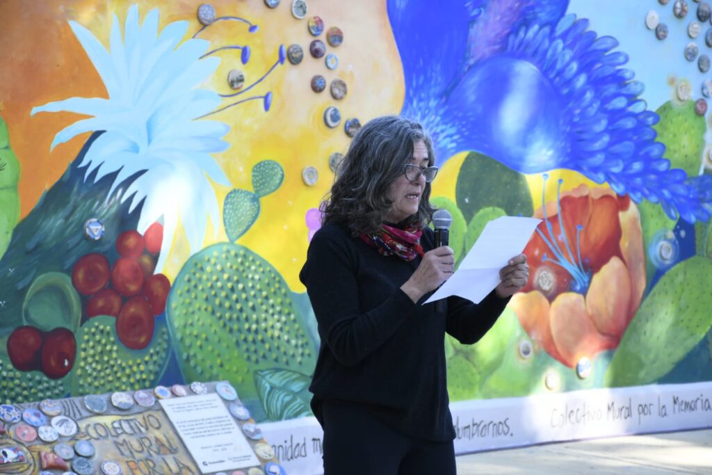 Uno de los ejes centrales de la jornada fue la presentación del mural restaurado, a cargo de un colectivo de artistas visuales de El Bermejo. La intervención incluyó además una instancia participativa, donde los asistentes pudieron sumarse mediante el pegado de teselas, reforzando la idea de construcción colectiva de la memoria.