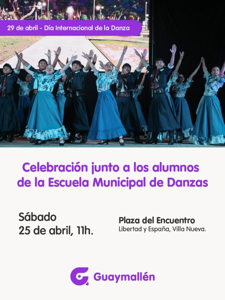 En el marco por el Día Internacional de la Danza, instaurado el 29 de abril, Guaymallén invita a participar de una celebración especial junto a los alumnos de la Escuela Municipal de Danzas. El evento se realizará el sábado 25 de abril, a las 11 hs., en la Plaza del Encuentro (Libertad y España, Villa Nueva).