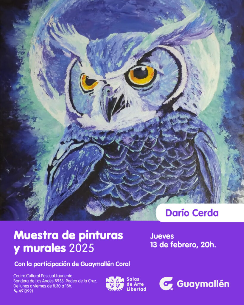 La Municipalidad de Guaymallén invita a participar de la inauguración de la muestra de pinturas del artista Darío Cerda. Será el jueves 13 de febrero, a las 20 hs., en el Centro Cultural Pascual Lauriente. El evento contará con la participación de la agrupación municipal Guaymallén Coral.