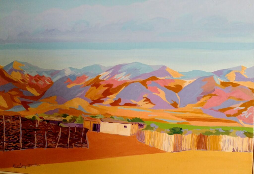 Elsa Leguizamón es licenciada en Artes Visuales, egresada de la Facultad de Arte de la UNCuyo. Ha realizado numerosas exposiciones en el ámbito local e internacional. El paisaje es casi una anécdota en los cuadros de Elsa. Su sello de identidad es el color, colores estridentes que delimitan valles y nos presentan horizontes azules sembrados de montañas.