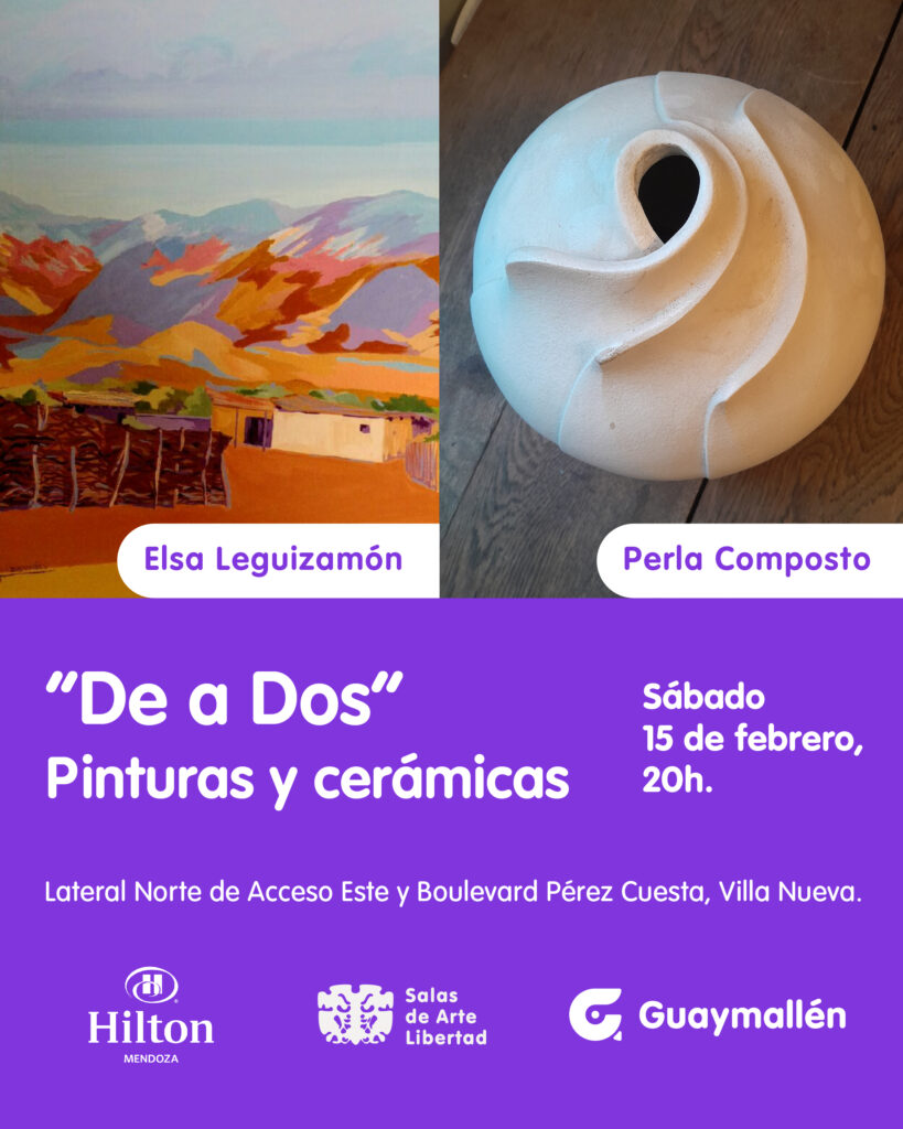 La Municipalidad de Guaymallén invita a participar de la inauguración de la muestra “De a Dos”, compuesta por pinturas y cerámicas de las artistas Elsa Leguizamón y Perla Hedy Composto. Será el sábado 15 de febrero, a las 20 hs., en el espacio de arte del Hotel Hilton, dependiente de Salas de Arte Libertad.