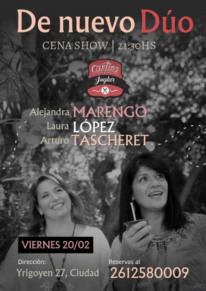 El próximo viernes 20 de febrero a las 21:30 horas, Cantina Juglar, ubicada en Yrigoyen 27 de la Ciudad de Mendoza, será escenario de una nueva propuesta musical con la presentación de De nuevo Dúo, en el formato de cena show que combina música en vivo y gastronomía.