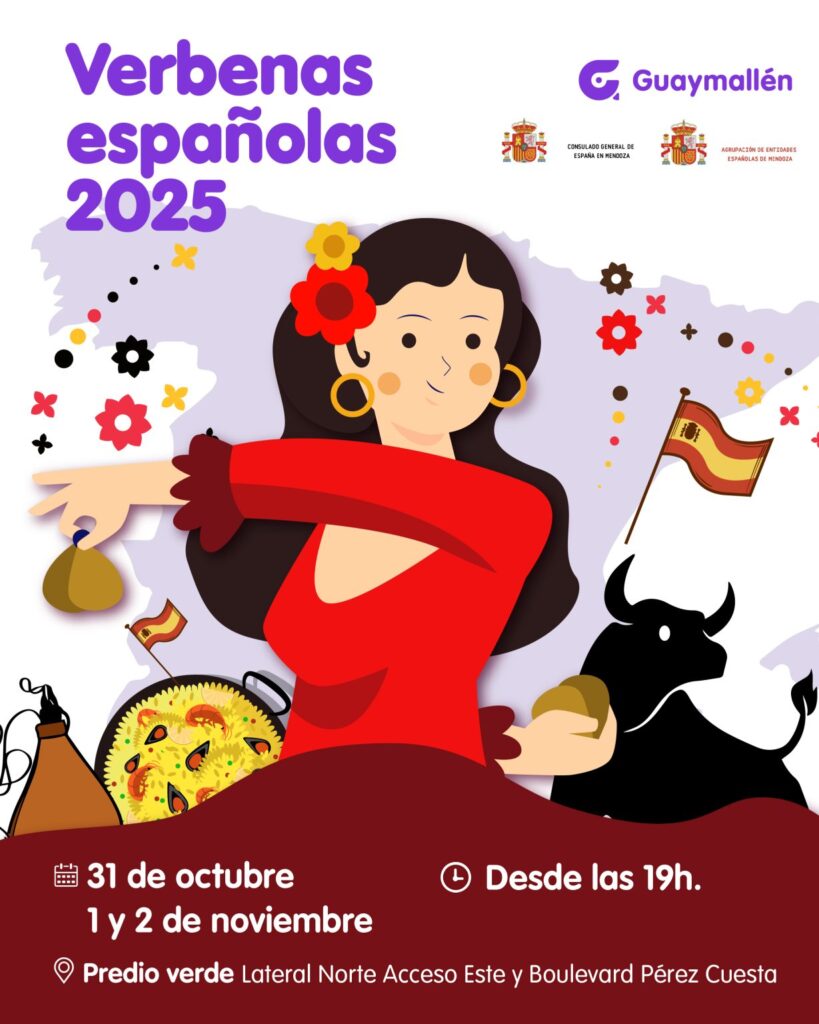 Llega una nueva edición de las tradicionales Verbenas Españolas en Guaymallén, la clásica fiesta que celebra las raíces y costumbres de la comunidad hispana. Habrá puestos gastronómicos, música, danzas típicas, artesanos y mucho color. Será en el predio verde de Lateral Norte de Acceso Este y Boulevard Pérez Cuesta (frente al Mendoza Shopping), este viernes 31 de octubre, sábado 1 y domingo 2 de noviembre, desde las 19 hs., con entrada libre y gratuita.