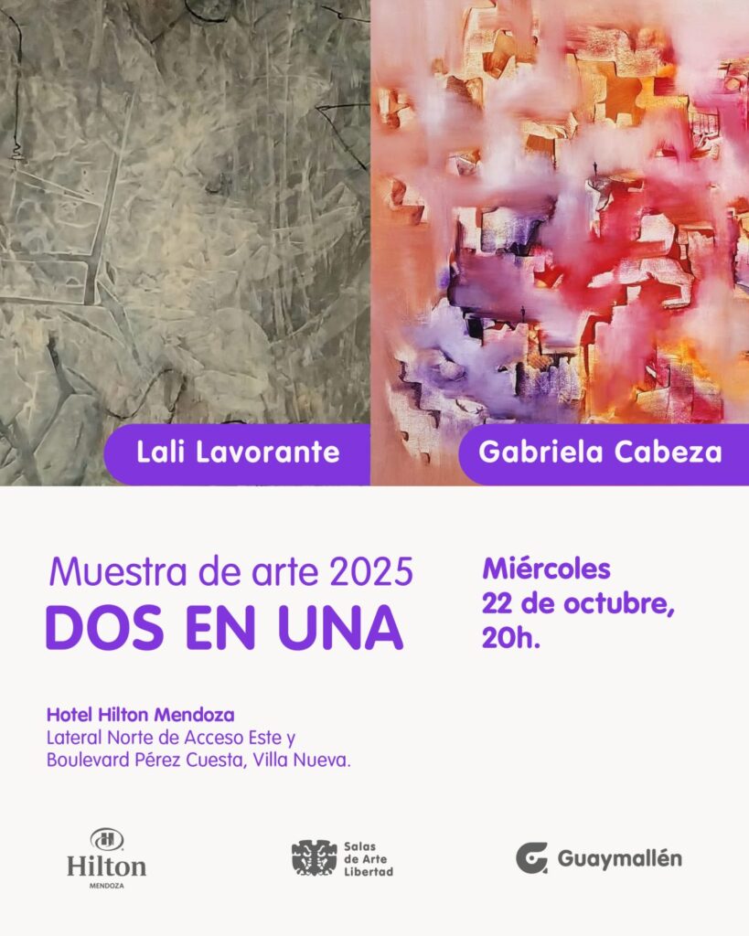 La Municipalidad de Guaymallén invita a participar de la apertura de la muestra “Dos en una”, compuesta por pinturas de las artistas Gabriela Cabeza y Lali Lavorante. La inauguración será el miércoles 22 de octubre, a partir de las 20 hs., en el espacio de arte del Hotel Hilton Mendoza.