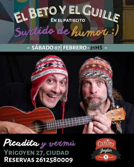 Este sábado 7 de febrero, desde las 21 hs., el humor será protagonista en El Patiecito de la Cantina del Juglar, con la presentación de El Beto y El Guille, que llegan con su espectáculo “Surtido de humor”, una propuesta descontracturada para disfrutar de risas, música y ocurrencias para todo público.