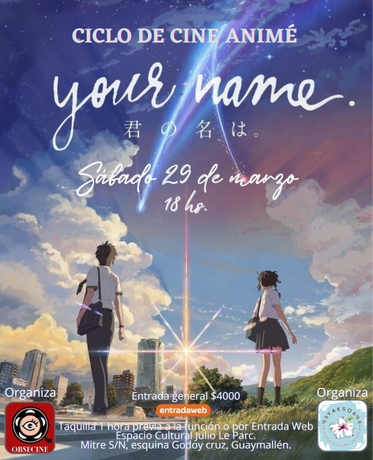 Gracias a la organización de Obsecine y Yaksok Mendoza, que se encargan de la difusión de la cultura asiática y de revivir grandes títulos de la animación japonesa en la pantalla grande, presentarán “Your Name”, en el Espacio Cultural Julio Le Parc. La película estará adaptada al doblaje latino en la sala Chalo Tulián del lugar, el próximo sábado 29 de marzo, a las 18 hs.