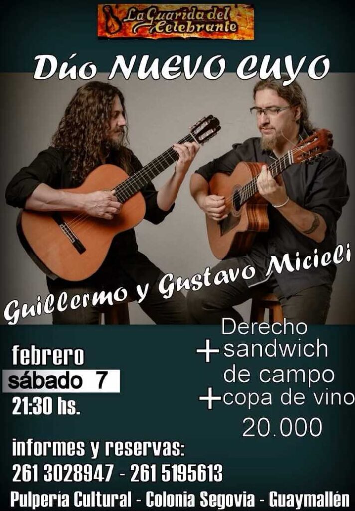 El sábado 7 de febrero, desde las 21.30 hs., la Pulpería Cultural de Colonia Segovia será escenario de una noche dedicada a la música cuyana con la presentación del Dúo Nuevo Cuyo, integrado por Guillermo y Gustavo Micieli.