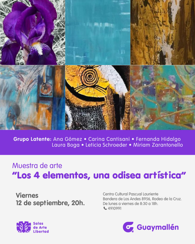 La Municipalidad de Guaymallén invita a participar de la inauguración de la muestra “Los 4 elementos, una odisea artística”, una exposición en la que se podrán ver las obras de Ana Gómez, Carina Cantisani, Fernanda Hidalgo, Laura Boga, Leticia Schroeder y Miriam Zarantonello, integrantes del grupo de arte Latente. El encuentro será el próximo viernes 12 de septiembre, a las 20h, en el Centro Cultural Pascual Lauriente, con entrada gratuita.