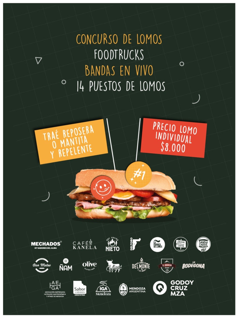Cabe destacar que entre los 14 comercios inscriptos, 9 son locales y 5 son invitados de departamentos vecinos. Entre las lomiterías locales se encuentran Don Mateo Casa de Comidas, Del Monte Lomos, Olive Gluten Free, La Colina Parrilla, La Bodegona, El Quincho Resto Bar, Ñam Lomos, Esquina Oeste y Sanguchitos Ya. Mientras que las invitadas serán La Fábrica de Lomos (Ciudad de Mendoza), Café Kanela (Guaymallén), Hoy Cocina Nieto (Luján de Cuyo), Mechados (Maipú) y Del Toro Lomos (Las Heras).