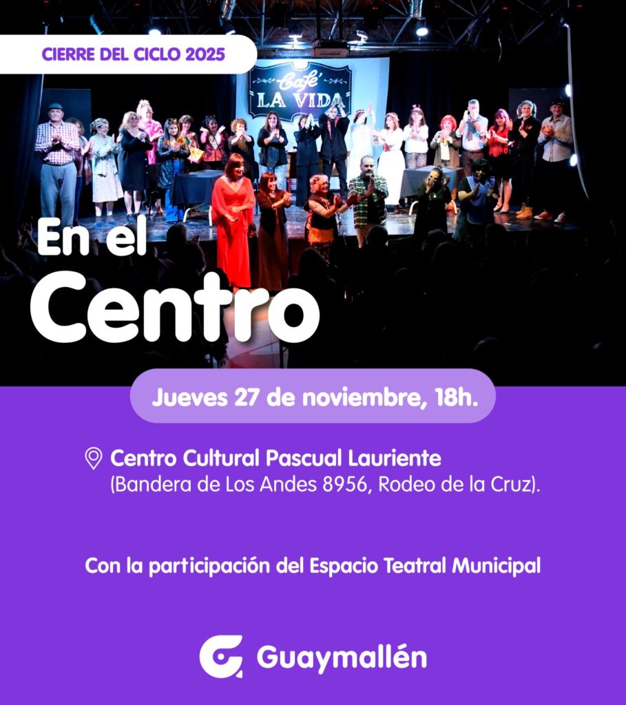 La Municipalidad de Guaymallén invita al cierre anual del programa “En el Centro”, que se realizará el próximo miércoles 27 de noviembre, a las 18 hs., en el Centro Cultural Pascual Lauriente (Bandera de Los Andes 8956, Rodeo de la Cruz), con entrada gratuita y cupos limitados, hasta completar la capacidad de la sala.