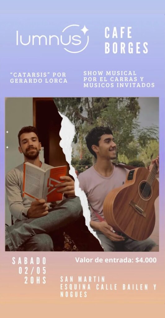 Se espera una noche de gran calidez e intimidad, donde la palabra y la música se unirán para ofrecer una experiencia distinta en el este mendocino. Aquellos interesados en asistir podrán acercarse directamente al café en el horario indicado para asegurar su lugar en este evento organizado por Lumnus.