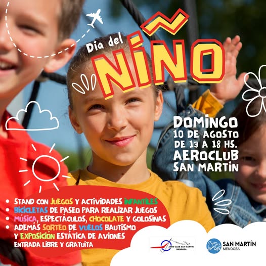 Festejo del Día del Niño en el Aeroclub San Martín (Ruta 50, kilómetro 1038), con chocolate caliente, juegos, paseos en bicicleta, espectáculos y exhibición estática de aviones.