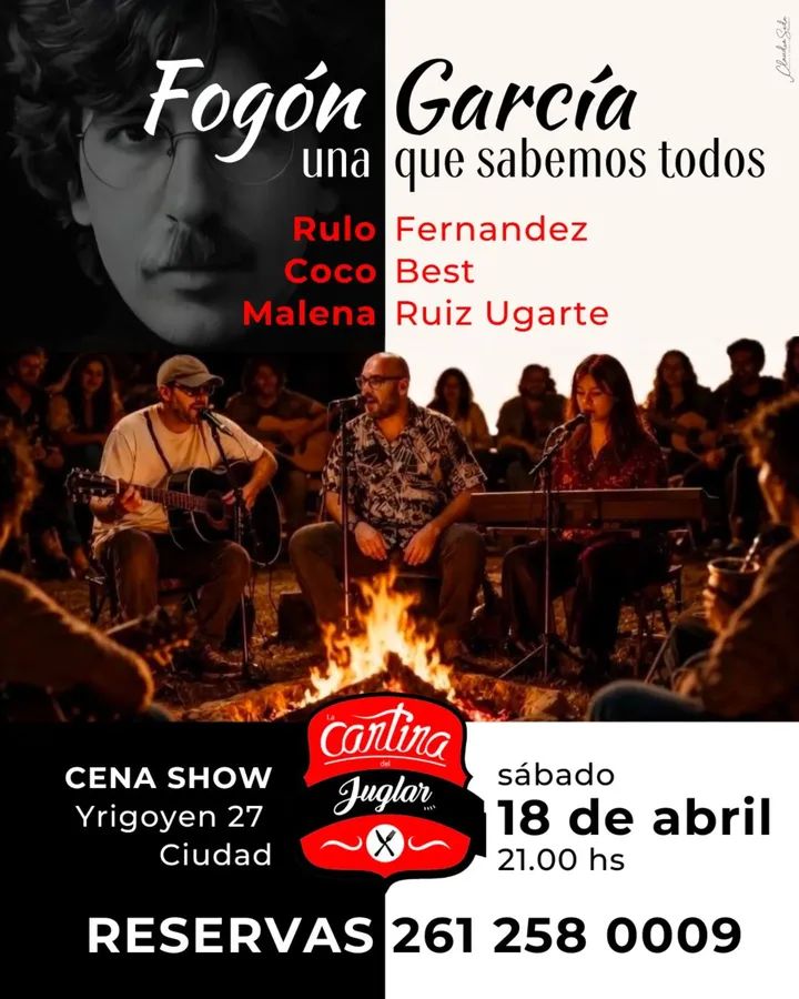 El espectáculo Fogón García, una propuesta musical que reúne a destacados artistas, se presentará el sábado 18 de abril a las 21:00 horas en el espacio Cantina del Juglar, ubicado en Yrigoyen 27 de Ciudad.