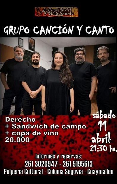 El grupo Canción y Canto ofrecerá un espectáculo en vivo el sábado 11 de abril a las 21:30 horas en La Guarida del Celebrante, (Carril Buenos Vecinos 7598, Colonia Segovia, Guaymallén).