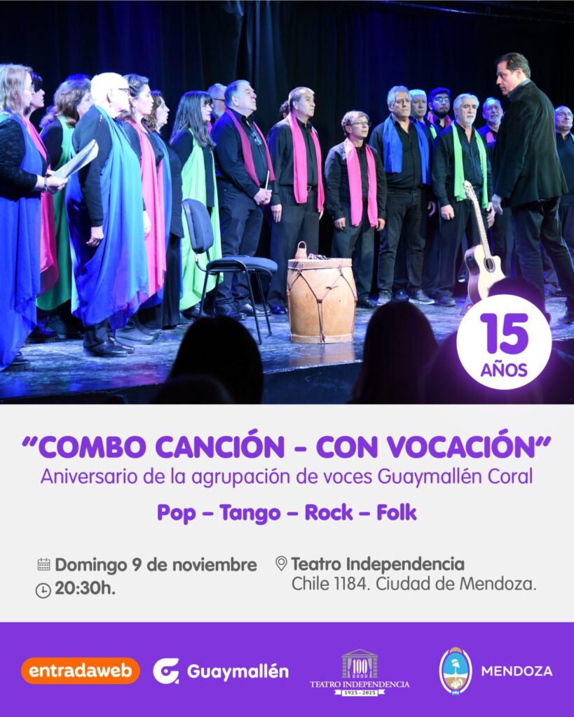 El sábado 9 de noviembre, a las 20:30 hs., el emblemático Teatro Independencia será escenario de un espectáculo imperdible: “Combo canción – Con vocación”, una propuesta de la agrupación Guaymallén Coral que reunirá pop, tango, rock y folk en un recorrido musical tan diverso como emotivo.