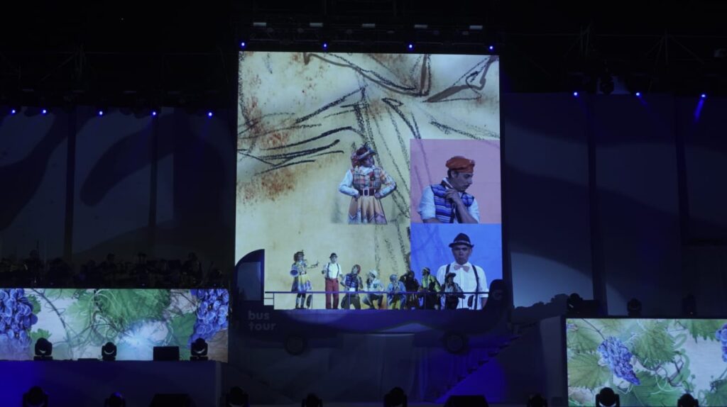 La velada comenzó evocando los paisajes que han forjado la identidad de Guaymallén. Con una obertura cargada de poesía, se conectó al público con el corazón de la región: los canales y acequias que riegan sus tierras fértiles. La voz de un guía, acompañado de su altavoz, dio la bienvenida a los asistentes, mientras un Tur Bus iniciaba su recorrido por la historia de la región. Entre leyendas de antiguos habitantes, bodegas y viñas, el bus atravesó los rincones más representativos de Guaymallén, una tierra cuna de artistas y poetas como Armando Tejada Gómez, quien plasmó en sus versos el alma de Mendoza.