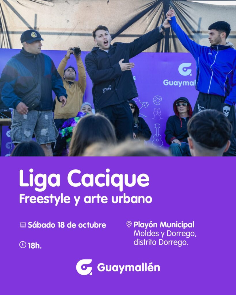 La Municipalidad de Guaymallén invita a toda la comunidad a disfrutar de la inauguración de la Liga Cacique, un nuevo evento de freestyle y arte urbano que recorrerá distintas plazas y espacios públicos del departamento.