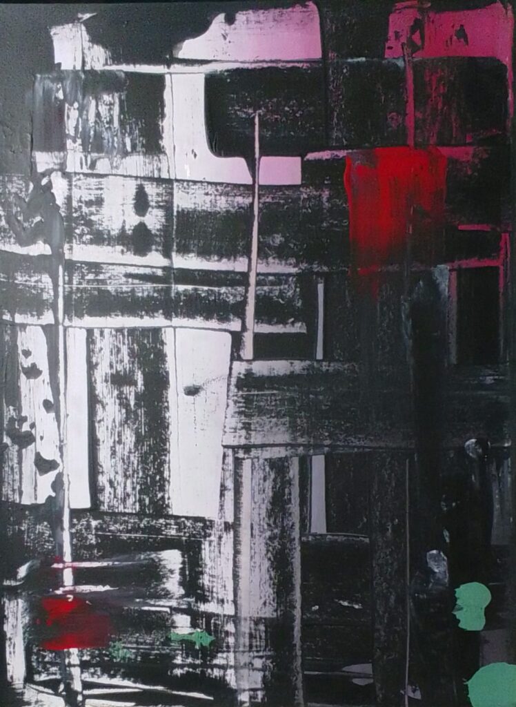 La propuesta reúne más de 40 obras realizadas sobre maderas y placas de yeso descartadas, materiales reutilizados que funcionan como soporte para la creación de imágenes de fuerte impronta gestual y gran carga expresiva. A partir del uso de elementos desechados, el artista resignifica aquello que ha sido abandonado, otorgándole una nueva identidad a través de la pintura.