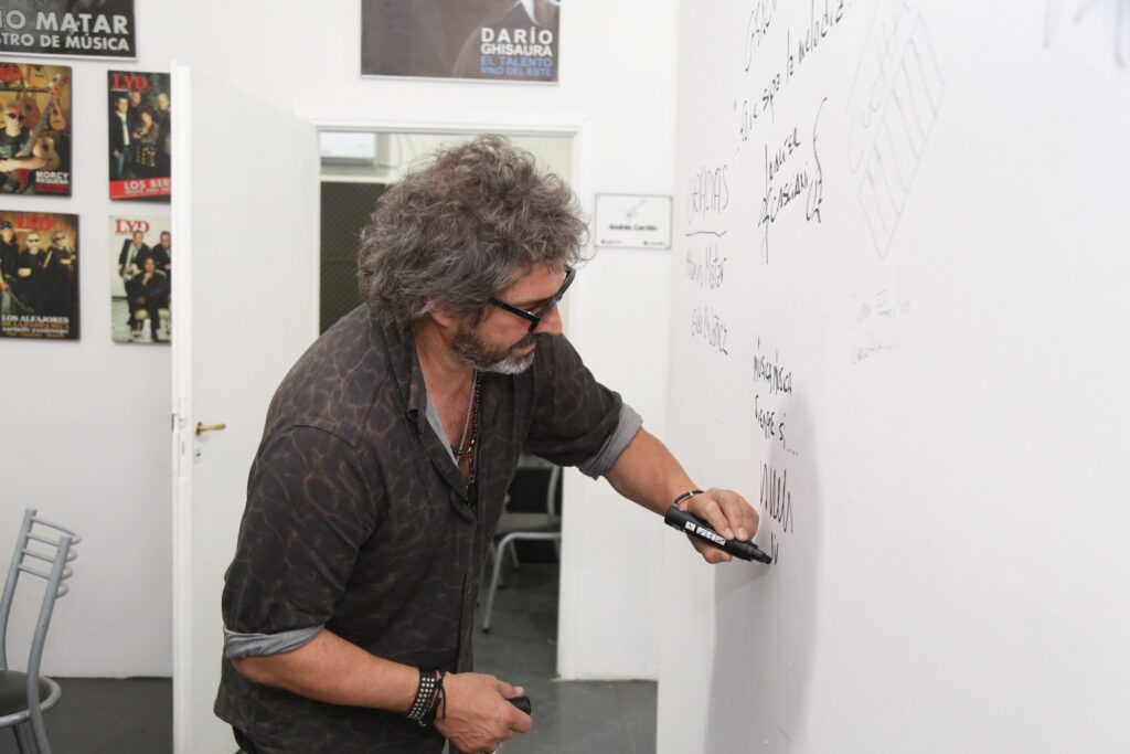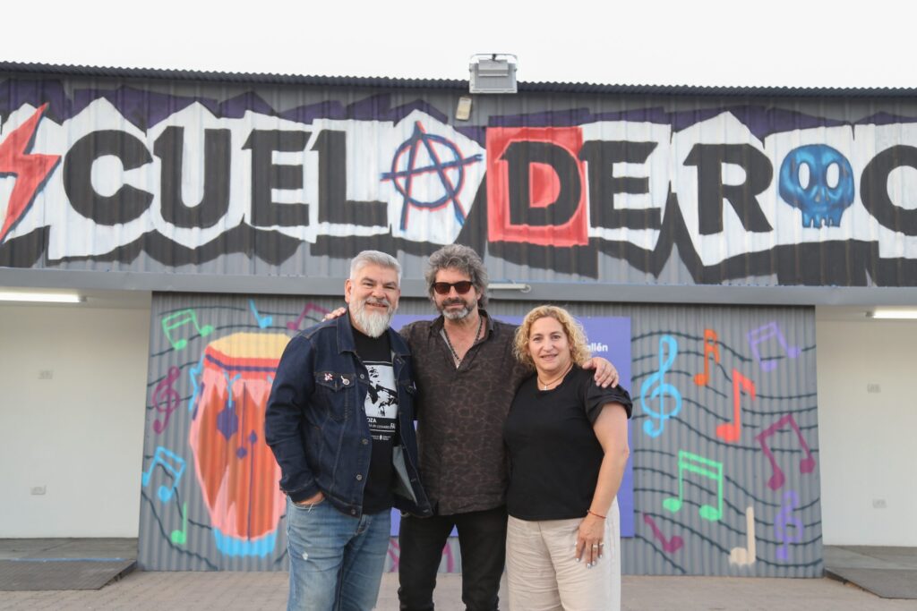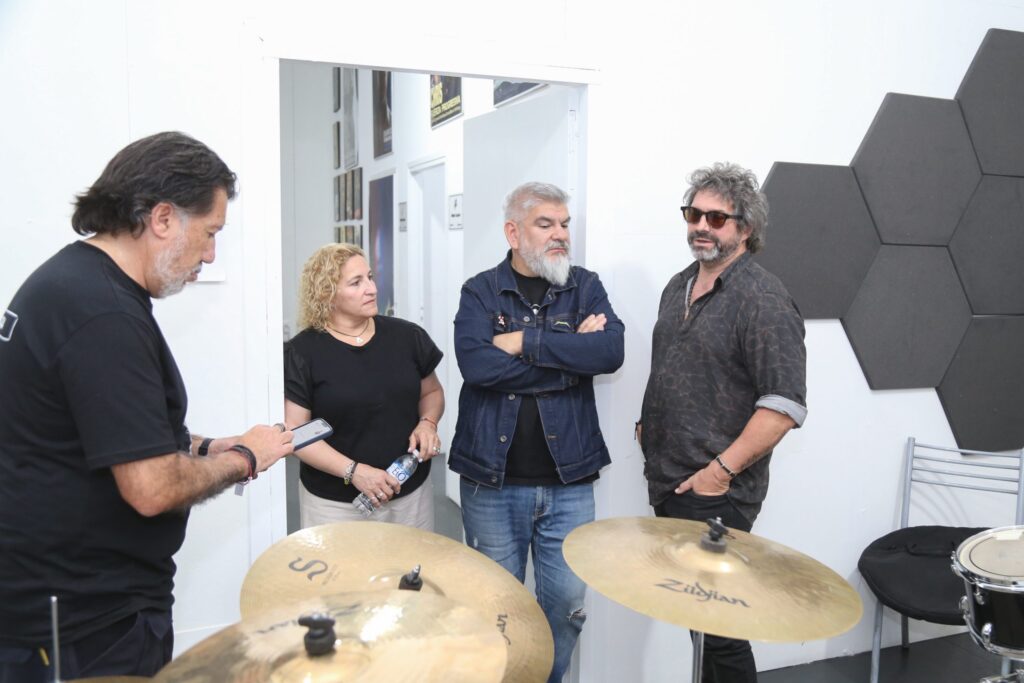 Aprovechando su estadía en la provincia, fue invitado también a conocer la sede de la Escuela Municipal de Rock Mario Mátar, única en su tipo en Mendoza, que está ubicada en la explanada del Espacio Cultural Julio Le Parc. Allí, recorrió las instalaciones acompañado por el subsecretario de Cultura de la Provincia, Diego Gareca, y la directora de Cultura y Turismo de Guaymallén, Carolina Vico.