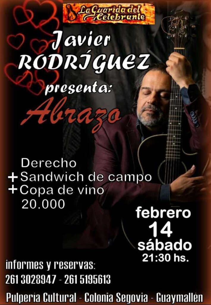 El reconocido músico Javier Rodríguez presentará su espectáculo “Abrazo” el próximo sábado 14 de febrero a las 21.30 horas en La Guarida del Celebrante, espacio ubicado en Carril Buenos Vecinos 7598, Colonia Segovia, Guaymallén.