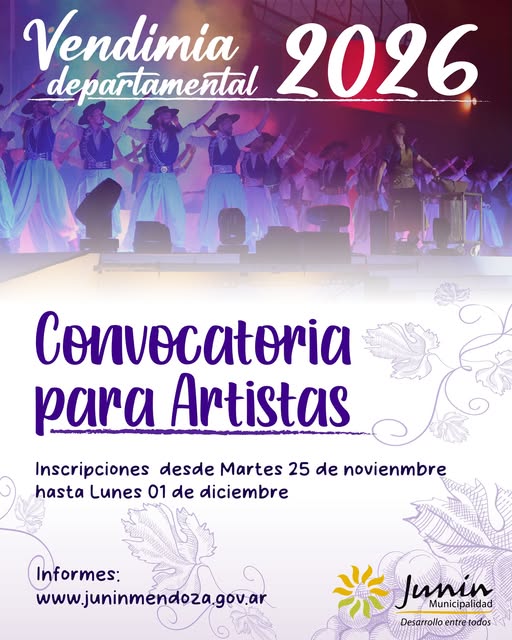 La Dirección de Gestión Cultural de Junín informa que desde el martes 25 de noviembre hasta el lunes 1 de diciembre a las 23.59 hs. se podrán realizar las inscripciones para participar del casting que elegirá a los artistas protagonistas de la Vendimia Departamental 2026, que se realizará el sábado 17 de enero en el Parque Recreativo Dueño del Sol.