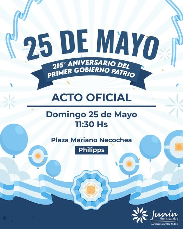 La Municipalidad de Junín invita a toda la comunidad a participar de los festejos por el 215° Aniversario de la Revolución de Mayo, en un emotivo encuentro que se llevará a cabo el domingo 25 de mayo desde las 11:30 hs., en la Plaza Mariano Necochea, ubicada en Philipps.