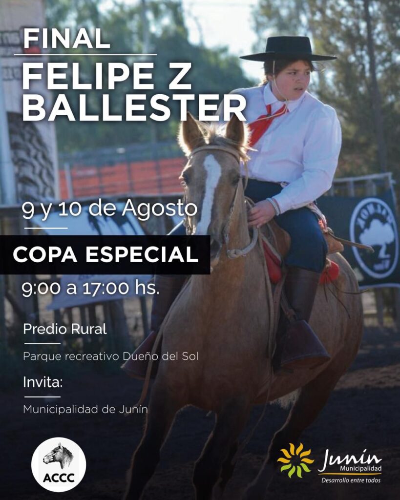 El próximo 9 y 10 de agosto, el Predio Rural del Parque Recreativo Dueño del Sol, en Junín, será escenario de la Final Felipe Z Ballester, una destacada competencia ecuestre que reunirá a jinetes y amazonas en una jornada de destreza y tradición.
