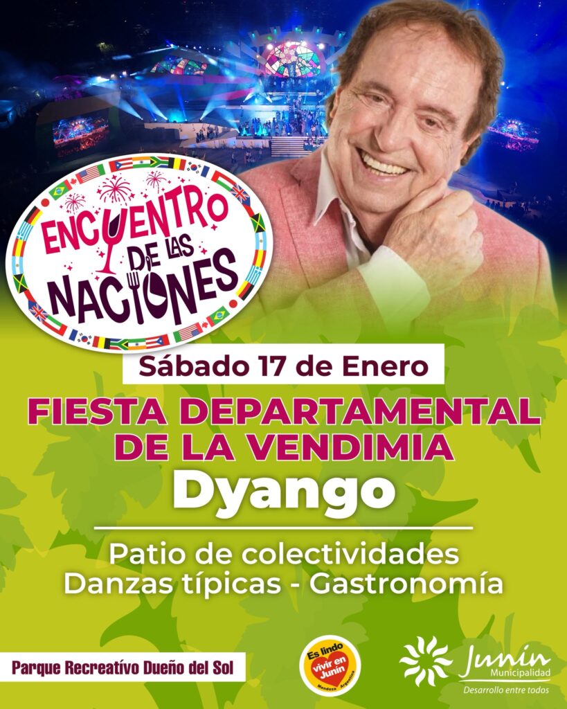 El sábado 17 de enero será el turno de la Fiesta Departamental de la Vendimia, uno de los momentos más esperados del calendario cultural juninense. La celebración combinará emoción, identidad y tradición, con una puesta artística que culminará con el show del reconocido Dyango. Al igual que el día anterior, el público podrá recorrer el patio de colectividades, disfrutar de danzas típicas, propuestas gastronómicas y del trabajo de artesanos y emprendedores. La entrada será libre y gratuita.