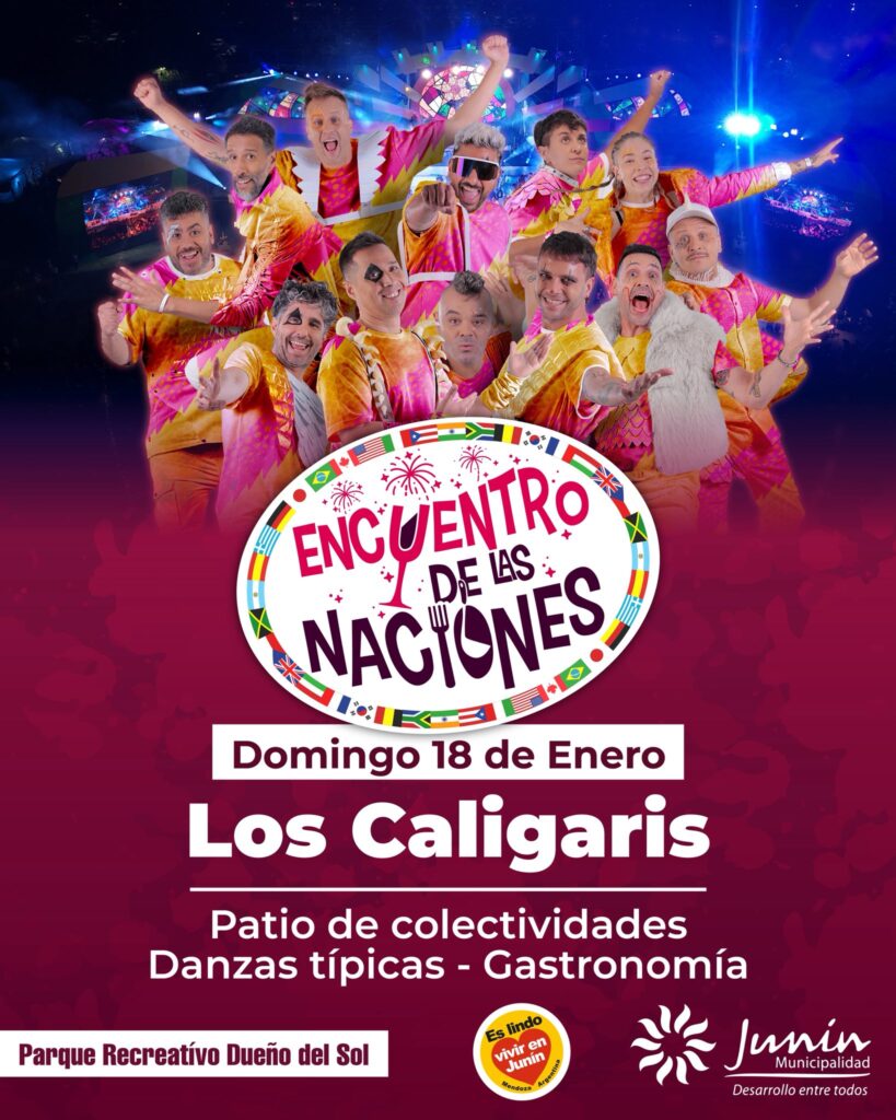 El domingo 18 de enero continuará el Encuentro de las Naciones, con una jornada pensada para compartir en comunidad. La música estará a cargo de Los Caligaris, acompañados por talentos locales, en un clima festivo ideal para cerrar el fin de semana. Gastronomía, danzas típicas y feria de artesanos volverán a ser protagonistas, con entrada libre para todo el público.