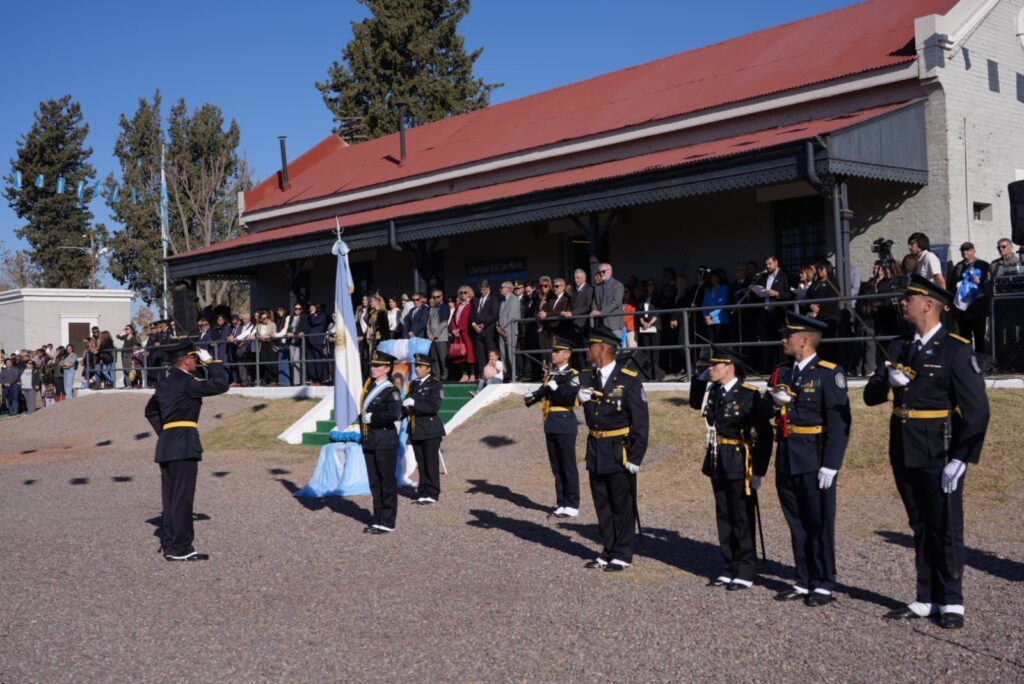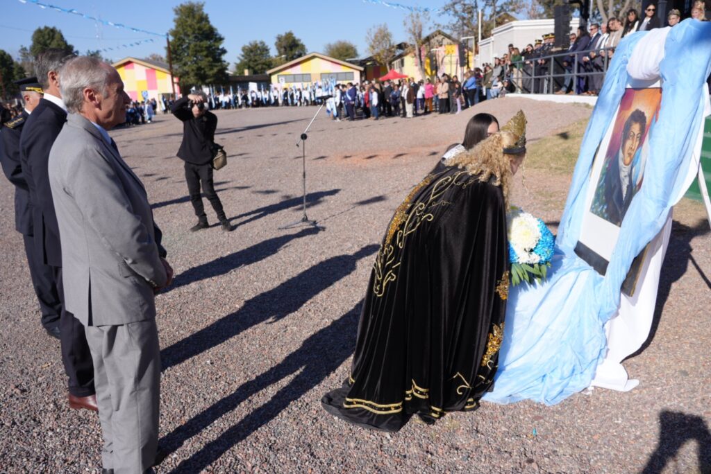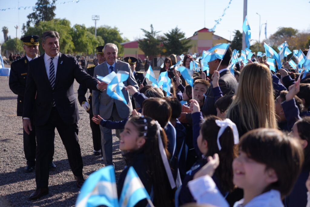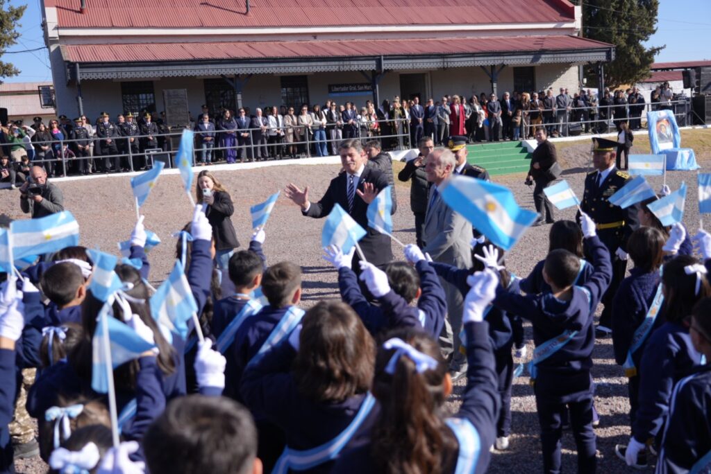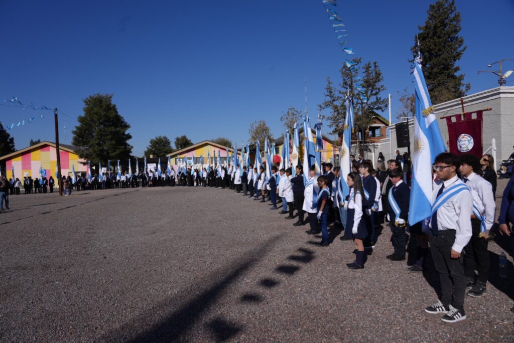El acto oficial se llevó a cabo en el predio del Centro Universitario del Este, en La Colonia, bajo un cielo celeste y blanco que se replicaba en las banderas, la vestimenta de los presentes y el espíritu de unidad. Encabezaron la ceremonia los intendentes Raúl Rufeil (San Martín) y Mario Abed (Junín), acompañados por autoridades provinciales, concejales, funcionarios municipales, representantes de fuerzas de seguridad, reinas vendimiales y una amplia representación de vecinos.