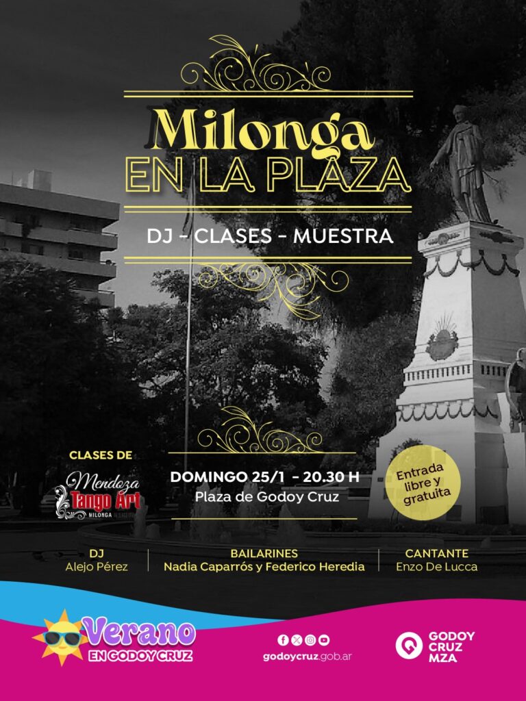 Godoy Cruz presenta una nueva propuesta cultural para el verano con Milonga en la Plaza. Se trata de un ciclo gratuito que invita a disfrutar del tango al aire libre en la plaza departamental. La cita será para los domingos 18 y 25 de enero.