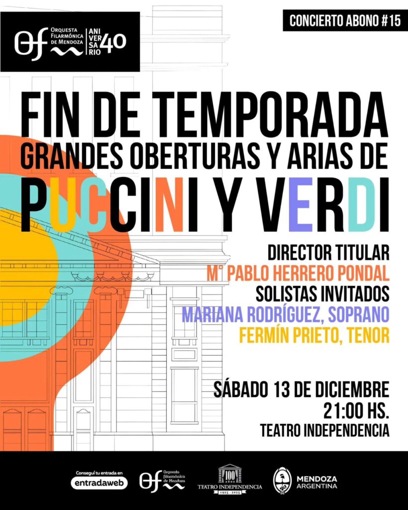 El sábado 13, a las 21 hs., el Teatro Independencia (Chile 1184, Ciudad de Mendoza) será el escenario del concierto “Grandes oberturas y arias de Puccini y Verdi”, que dará cierre a la temporada de la Orquesta Filarmónica de Mendoza.