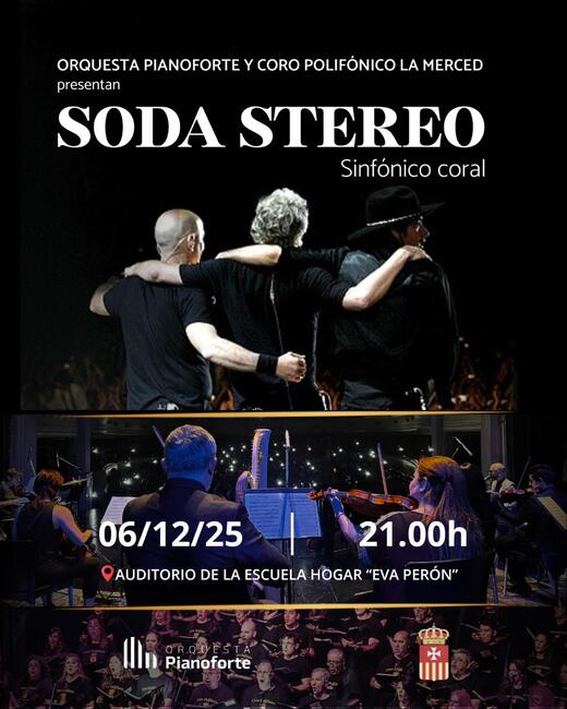 El sábado 6 de diciembre, la Fundación Pianoforte presentará “Soda Stereo Sinfónico Coral”, un gran homenaje a la legendaria banda de rock, interpretado por la Orquesta Pianoforte y el Coro Polifónico La Merced (Santa Fe), espectáculo declarado de interés legislativo y municipal en Santa Fe.