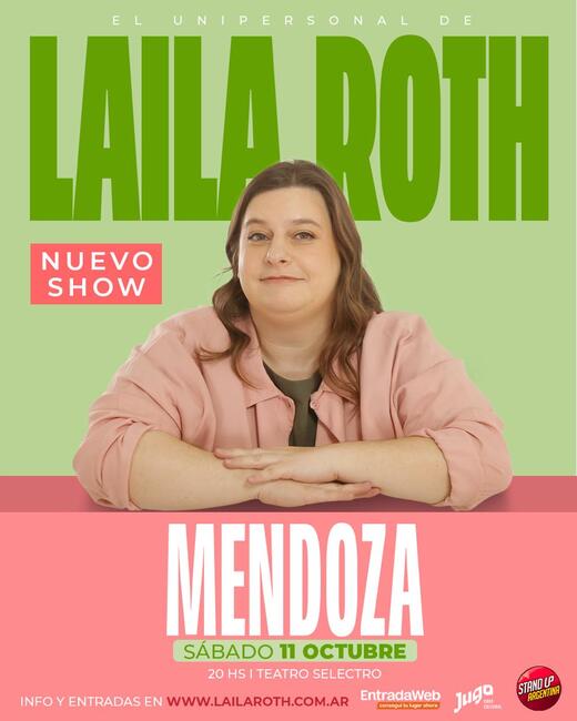 El sábado 11 de octubre, a las 20:00 hs., el Teatro Selectro (Capitán de Fragata Moyano 102, Ciudad) será el escenario del regreso de Laila Roth, una de las comediantes más queridas y destacadas de la escena del stand up argentino. En esta ocasión, la humorista presentará su nuevo show, una propuesta fresca, divertida y en constante construcción, que promete hacer reír al público mendocino de principio a fin.
