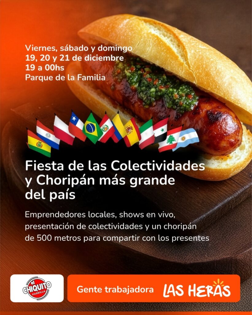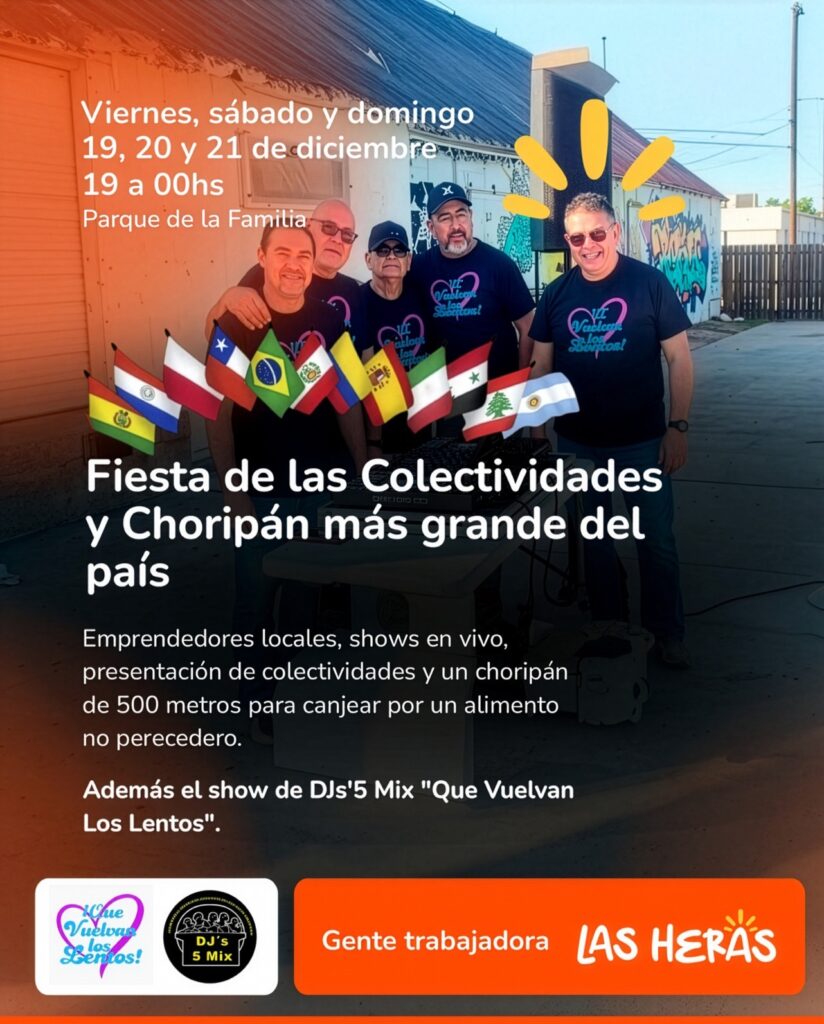 La Municipalidad de Las Heras convertirá el Parque de la Familia en un epicentro de sabor, cultura y encuentro comunitario. Durante los tres días, de 19 hs. a 0 hs., colectividades del departamento, emprendedores locales y expresiones culturales de distintos países formarán parte de una propuesta que combina identidad, compromiso social y entretenimiento para toda la familia. El evento incluirá la elaboración de un choripán récord y el show retro “Que vuelvan los lentos”, dos de las atracciones centrales del fin de semana.