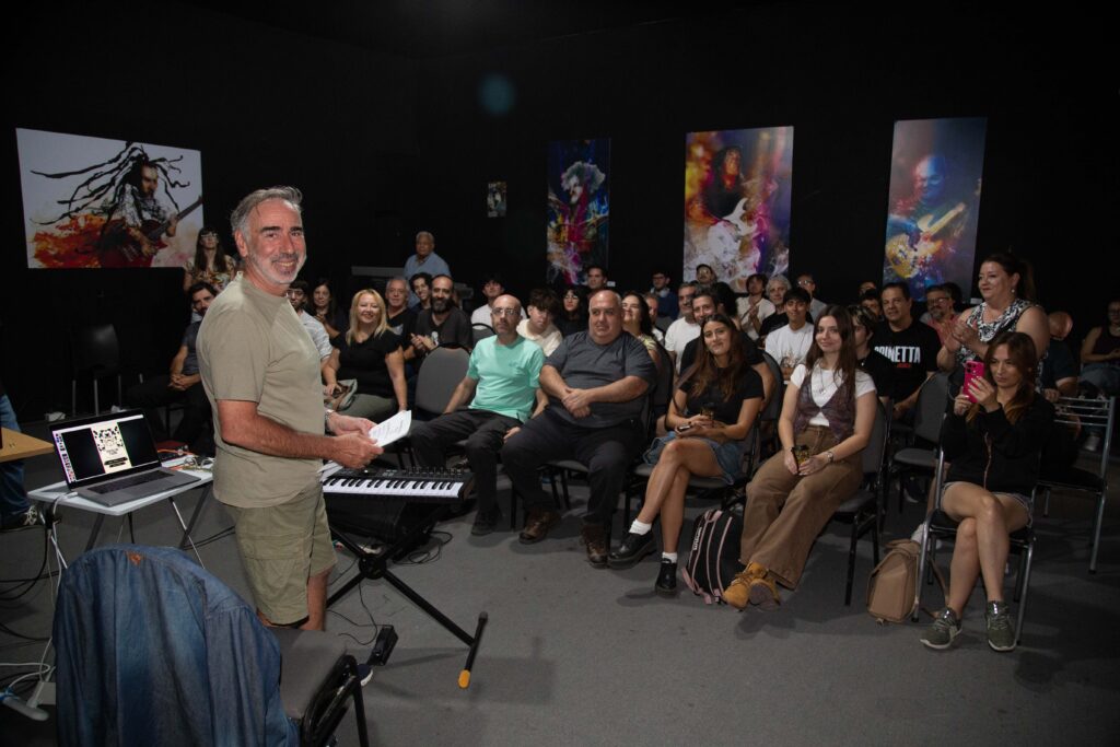En un ida y vuelta muy enriquecedor con los presentes, compartió anécdotas sobre los procesos creativos de los distintos discos de los que ha sido parte y su vínculo con otros artistas. También dialogó sobre su trabajo como compositor de música para películas y resaltó la importancia de la improvisación.