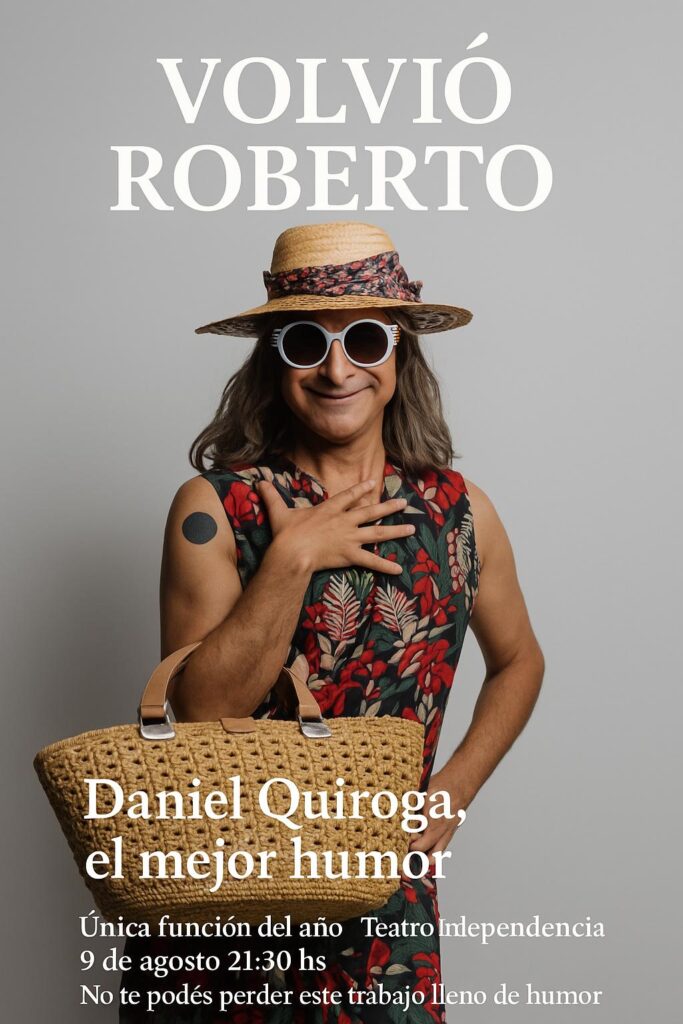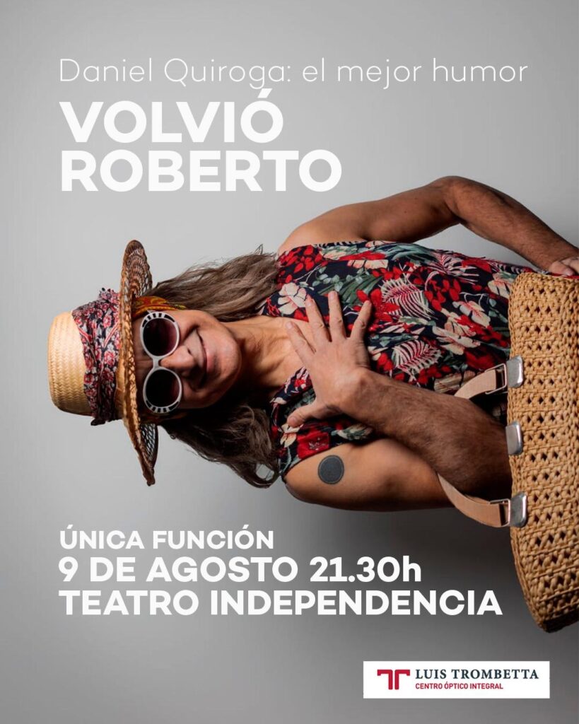 El próximo sábado 9 de agosto a las 21:30 hs., el reconocido actor y humorista Daniel Quiroga presentará en el Teatro Independencia su más reciente unipersonal: “Volvió Roberto”. Con funciones a sala llena en distintas salas de Mendoza como el Teatro Mendoza, la Nave Cultural, el Teatro Plaza de Godoy Cruz y el Selectro, esta obra ha sabido conquistar al público con una propuesta cargada de humor, ternura y reflexión.