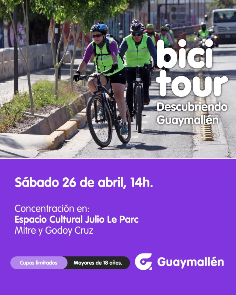 El próximo sábado 26 de abril se realizará una nueva edición del “Bicitour, un viaje al corazón de Guaymallén”, con novedosas propuestas para disfrutar del arte, el vino y el turismo local. La convocatoria será a las 14h en el Espacio Cultural Julio Le Parc (Mitre y Godoy Cruz, de San José).
