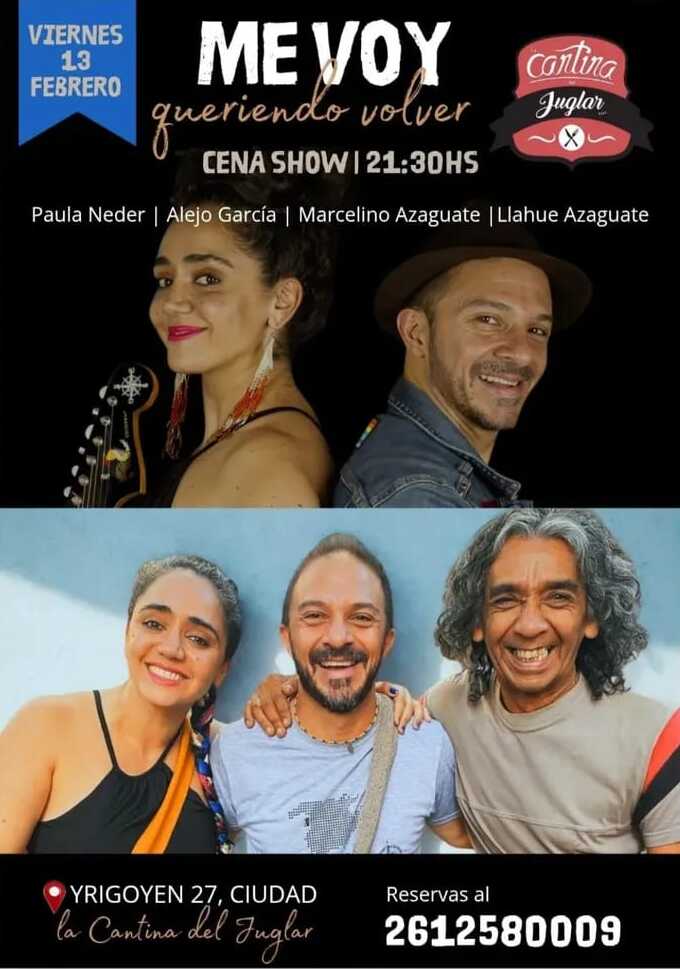 El viernes 13 de febrero se presentará el espectáculo Me voy queriendo volver, una propuesta artística que combina música en vivo y encuentro con el público en formato cena show. La función tendrá lugar a las 21:30 horas en La Cantina del Juglar, ubicada en Yrigoyen 27, en Ciudad.