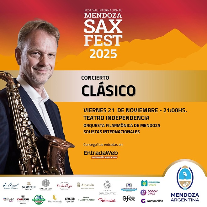 Los mejores saxofonistas del mundo, en una noche inolvidable junto a la Filarmónica de MendozaEl Festival Internacional Mendoza Sax Fest 2025, con el apoyo de la Subsecretaría de Cultura de Mendoza, presenta el viernes 21 de noviembre a las 21 hs. su noche clásica en el Teatro Independencia (Chile 1184, Ciudad). En un concierto sin precedentes, la Orquesta Filarmónica de Mendoza compartirá escenario con los más destacados solistas del mundo, entre ellos Arno Bornkamp (Holanda), Jeremy Koch y Jonathan Helton (EE. UU.) y Bera Romairone (Suiza). Obras originales para saxofón y orquesta, sonoridades nuevas y la presencia del mendocino Mauricio Agüero como anfitrión prometen una velada de altísimo nivel artístico.
