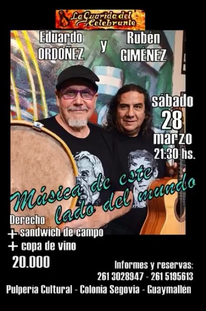 La Pulpería Cultural de Colonia Segovia, en Guaymallén, será escenario de una propuesta artística que combina música y tradición. El sábado 28 de marzo, a partir de las 21:30 hs., se presentarán Eduardo Ordóñez y Rubén Giménez con un espectáculo titulado Música de este lado del mundo.