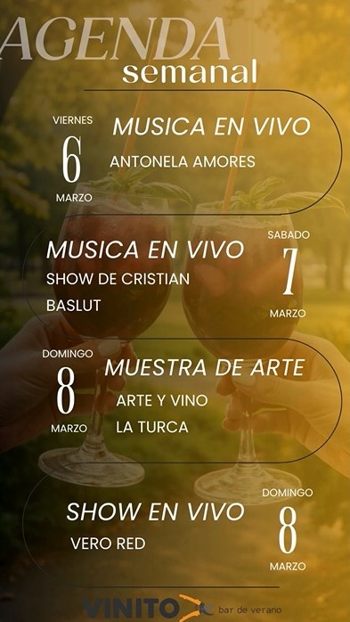 El ciclo cultural de Vinito Bar de Verano presenta una nutrida agenda para el primer fin de semana de marzo, con propuestas que combinan música en vivo, arte y vino.