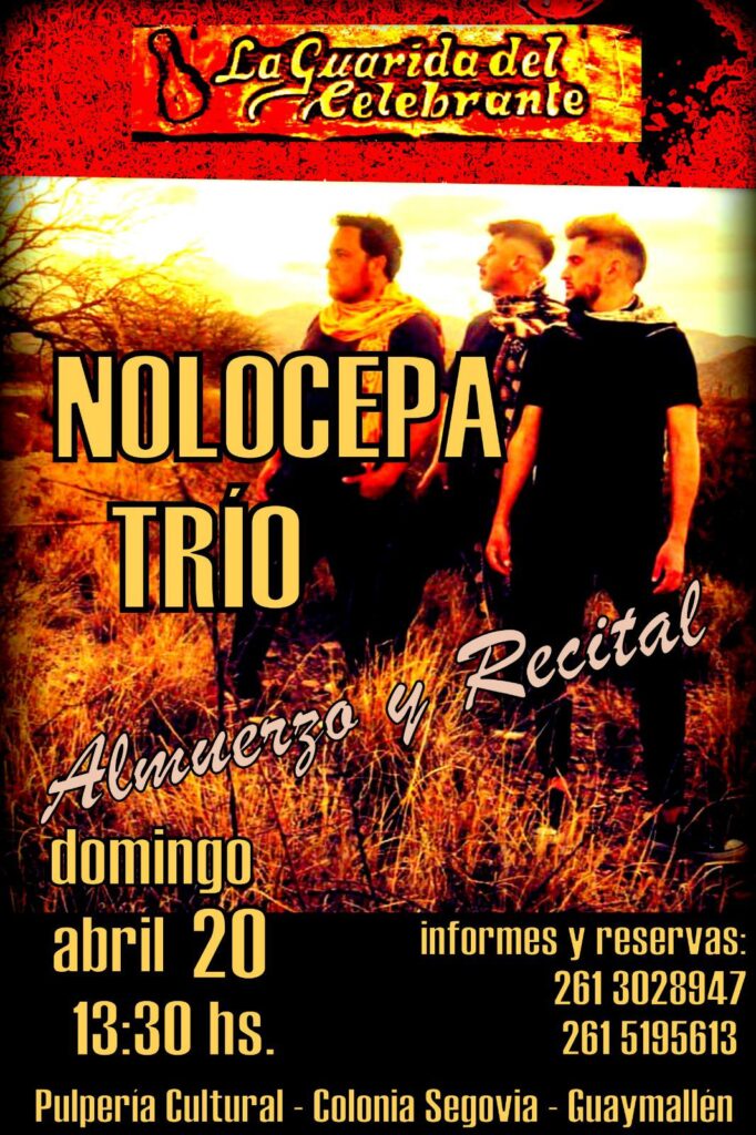 El domingo 20 de abril a partir de las 12:30 hs. NOLOCEPA TRIO subirán al escenario de La Guarida del Celebrante (Buenos Vecinos 7598, Colonia Segovia, Guaymallén) para compartir con los amantes de nuestra música un seguro gran momento.