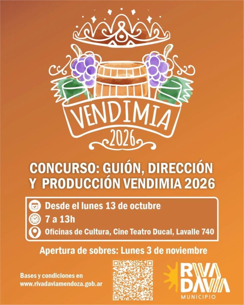 El espíritu vendimial comienza a sentirse en Rivadavia. Con el objetivo de dar los primeros pasos hacia una nueva celebración de la cosecha, el Municipio lanza dos convocatorias que invitan a toda la comunidad a ser parte activa de la Vendimia 2026: la Convocatoria de Reinas Distritales y el Concurso de Guion, Dirección y Producción.
