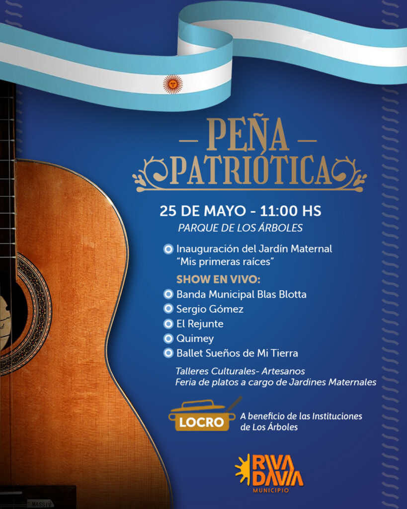 El sábado 25 de mayo, desde las 11 hs., la celebración continuará con una gran Peña Patriótica en el Parque de Los Árboles. En este marco se inaugurará el Jardín Maternal “Mis primeras raíces”, una obra muy esperada por la comunidad que fortalecerá el acceso a la educación en el distrito. Durante toda la jornada habrá shows en vivo con la Banda Municipal Blas Blotta, Sergio Gómez, El Rejunte, Quimey y el Ballet Sueños de Mi Tierra. Además, se podrá disfrutar de talleres culturales, exposición de artesanos y una feria de platos típicos organizada por jardines maternales. Como cada año, no faltará el tradicional locro patrio, cuya recaudación será destinada a beneficio de las instituciones del distrito.