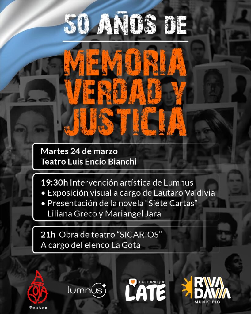 La Municipalidad de Rivadavia invita a la comunidad a participar de la jornada conmemorativa por los 50 años de Memoria, Verdad y Justicia, que se realizará el martes 24 de marzo en el Teatro Luis Encio Bianchi.